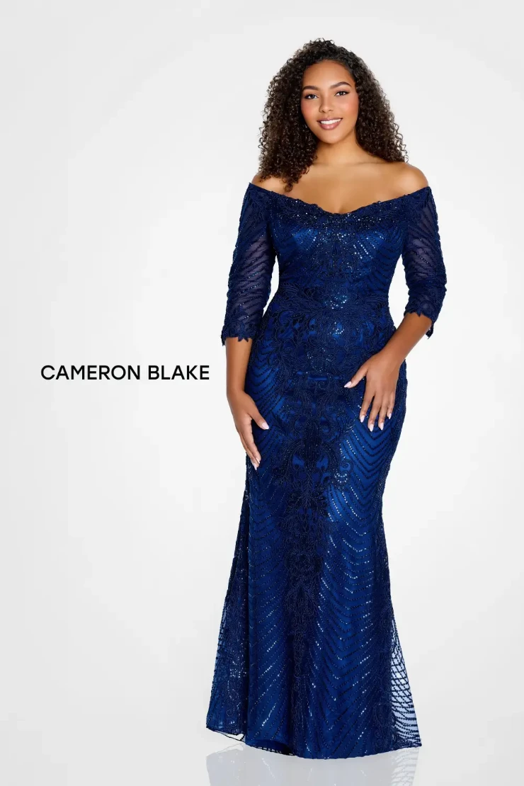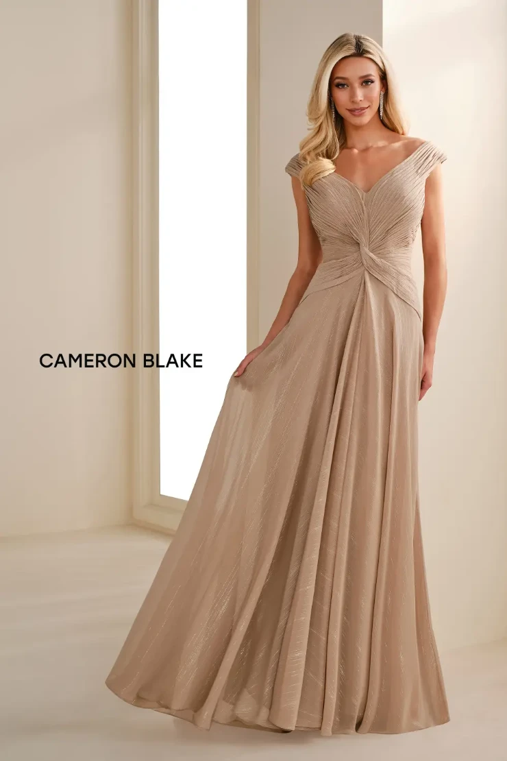 A-line gown with a bateau neckline, cap sleeves, and a dropped waist in a novelty metallic chiffon fabric. Shawl included.