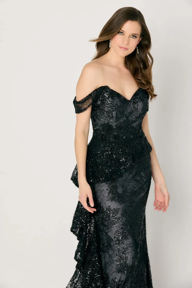 Dazzle the crowd in this exquisite fit and flare gown. The flattering sweetheart neckline is complemented by elegant draped sleeves that exude style and grace. Stunning cascading ruffle detail and exquisite sparkling sequin embellishments elevate the glamor of this spectacular gown.