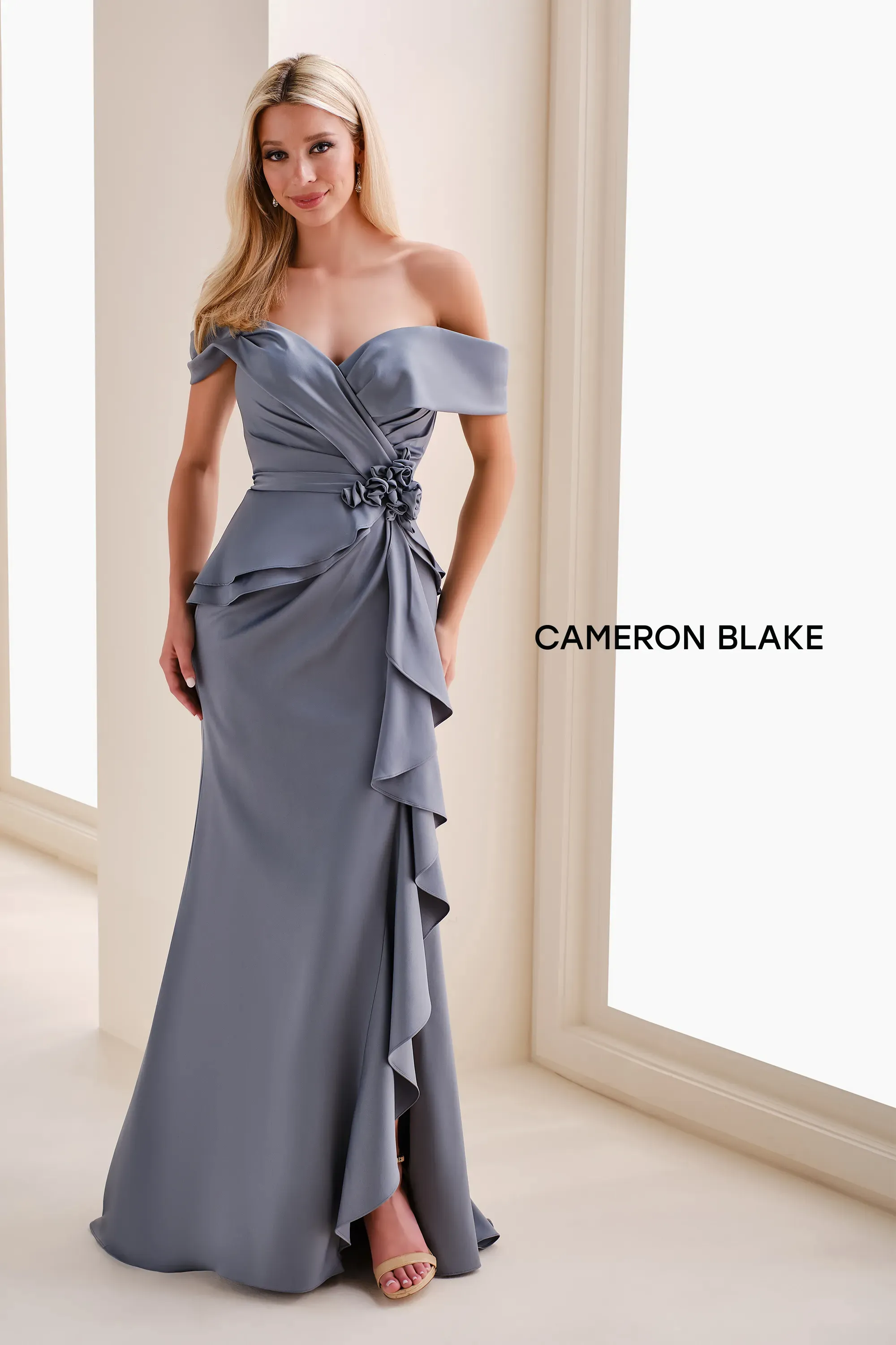 Refined and graceful, this stretch sateen mermaid gown features a sweetheart neckline and off-the-shoulder sleeves. Its sleek silhouette offers a polished look, perfect for a celebration.