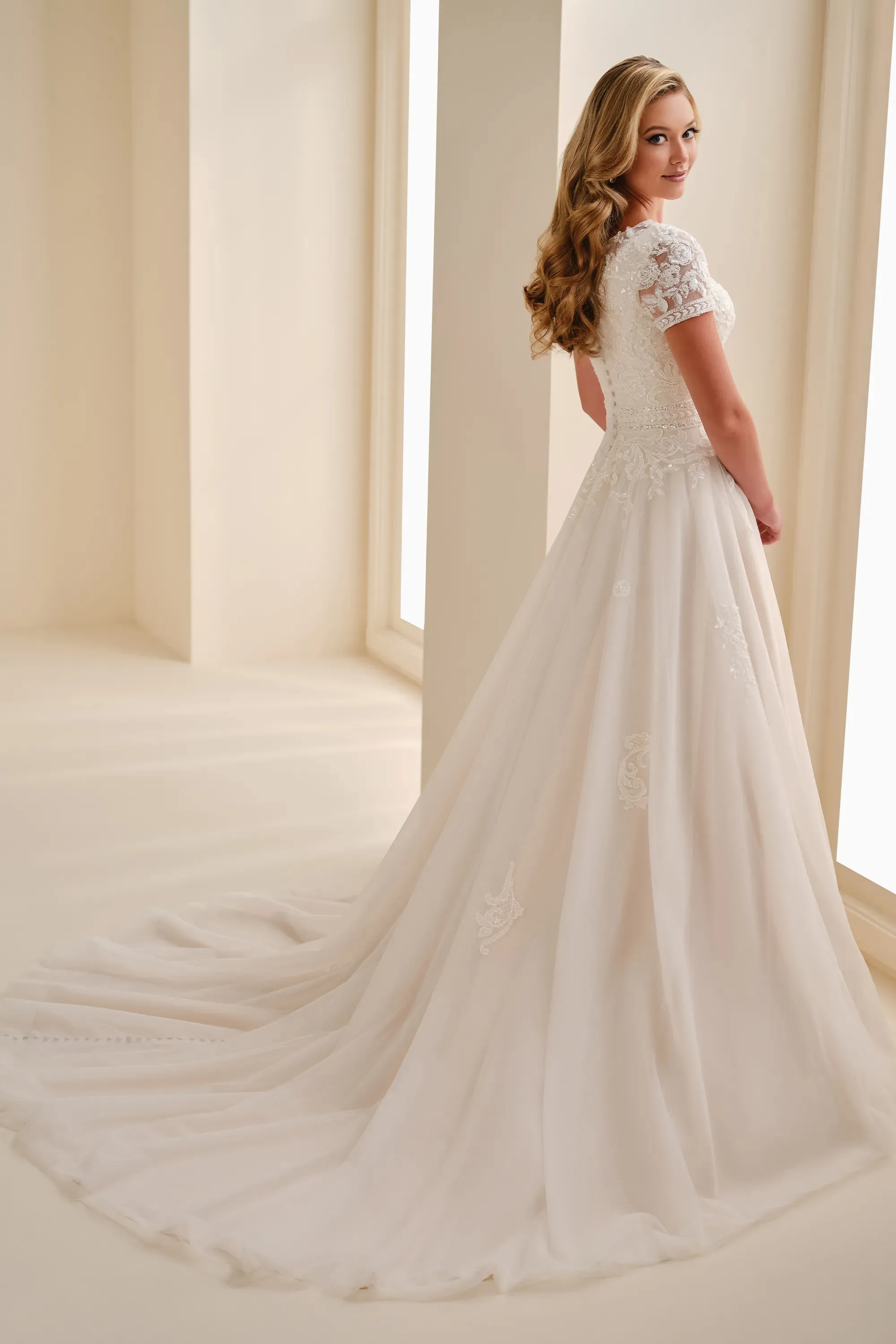 Graceful and refined, this long A-line gown showcases a delicate lace jewel neckline that glimmers with subtle sequin accents. The soft short sleeves and intricate lace appliqué create a light, feminine charm perfect for the modern romantic bride.
