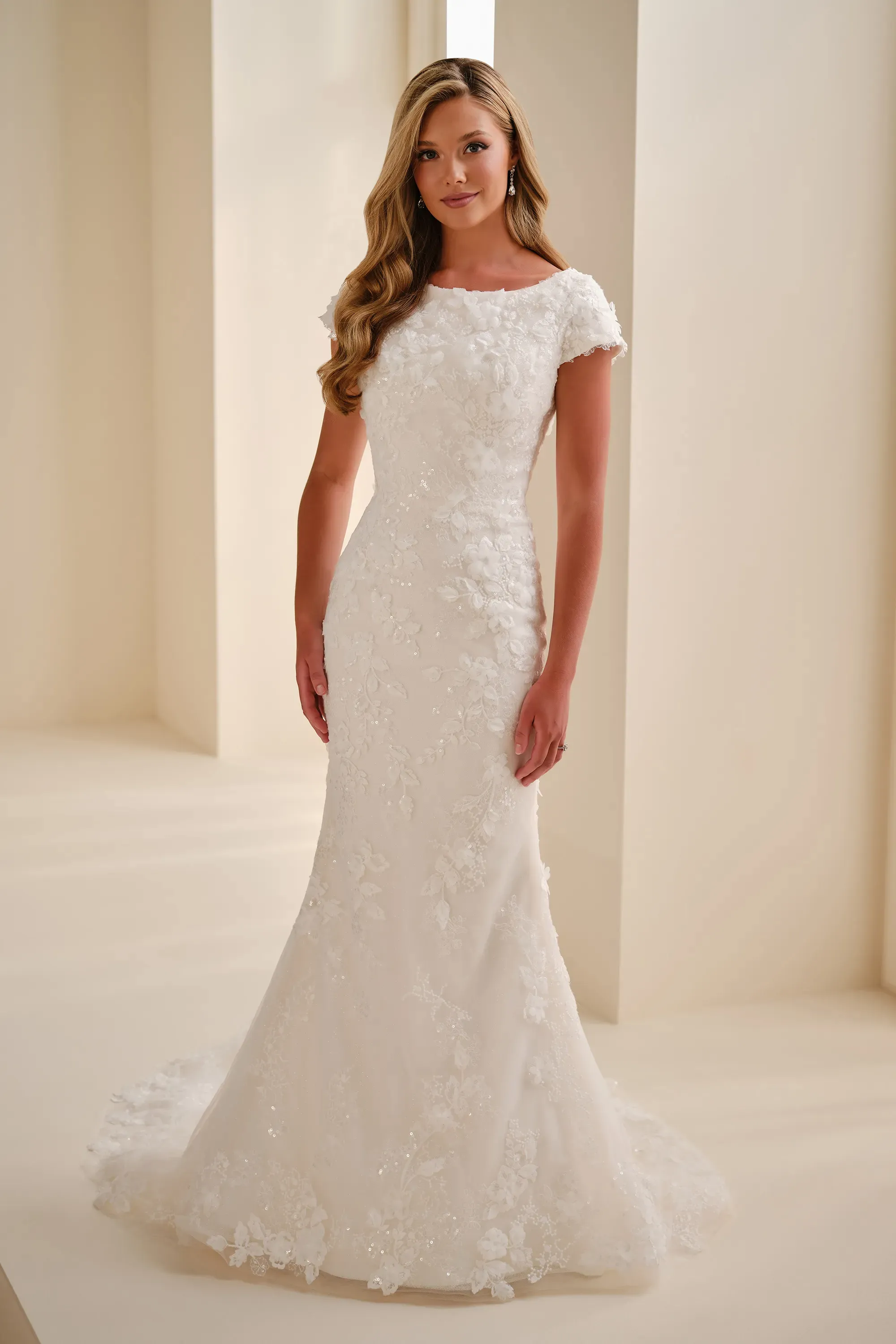Delicately adorned with 3D floral lace appliqués, this long fit-and-flare gown features a graceful jewel neckline and cap sleeves for an elegant silhouette. Covered back buttons add a classic touch, while layers of tulle create a romantic, textured finish.