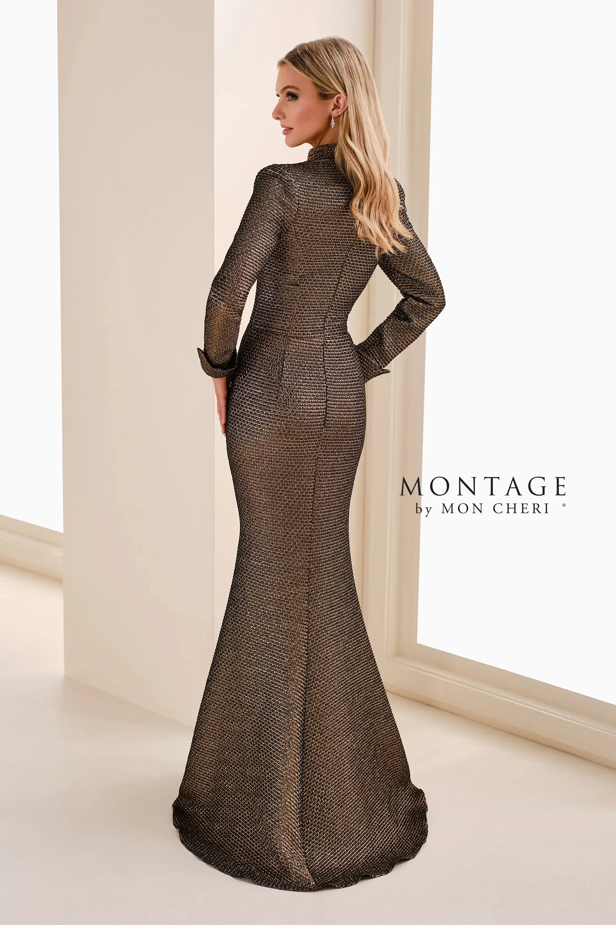 This figure-flattering fit-and-flare gown features dramatic long sleeves that frame the shoulders with exquisite elegance. Crafted in shimmering metallic matelassé, it is accentuated by a plunging illusion V-neck, while a separate center-front modesty panel adds a sophisticated finish.